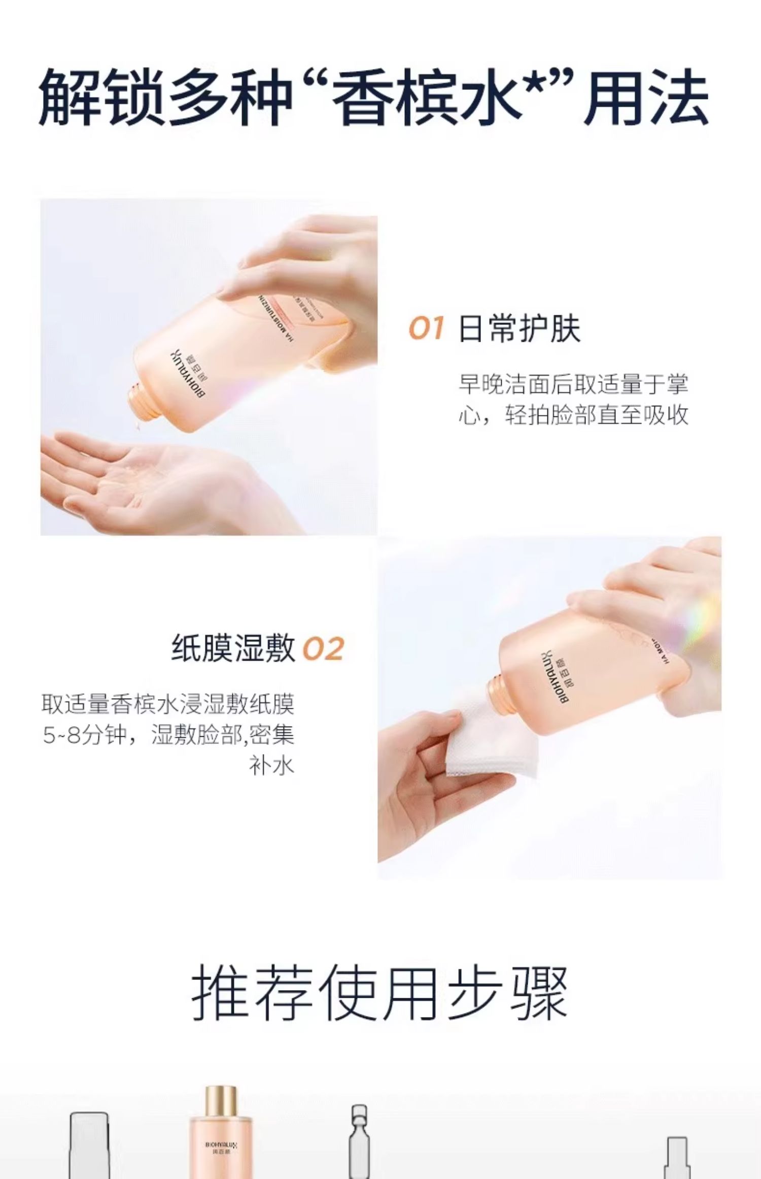• 日常轻拍: 早晚洁面后,取适量于掌心,轻轻拍打面部至吸收。