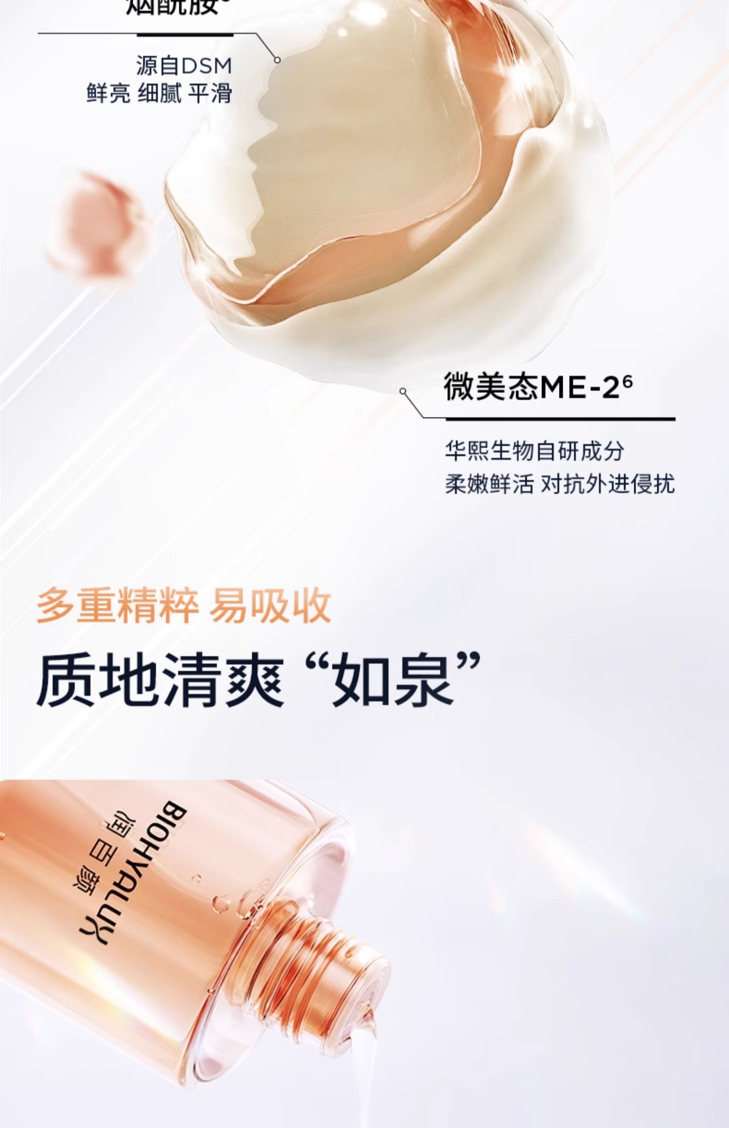 融合透明质酸 × 二裂酵母 × 维生素B5 × 烟酰胺的高能组合,为干燥、脆弱的肌肤注入层层水润与光泽,重拾柔软与通透。