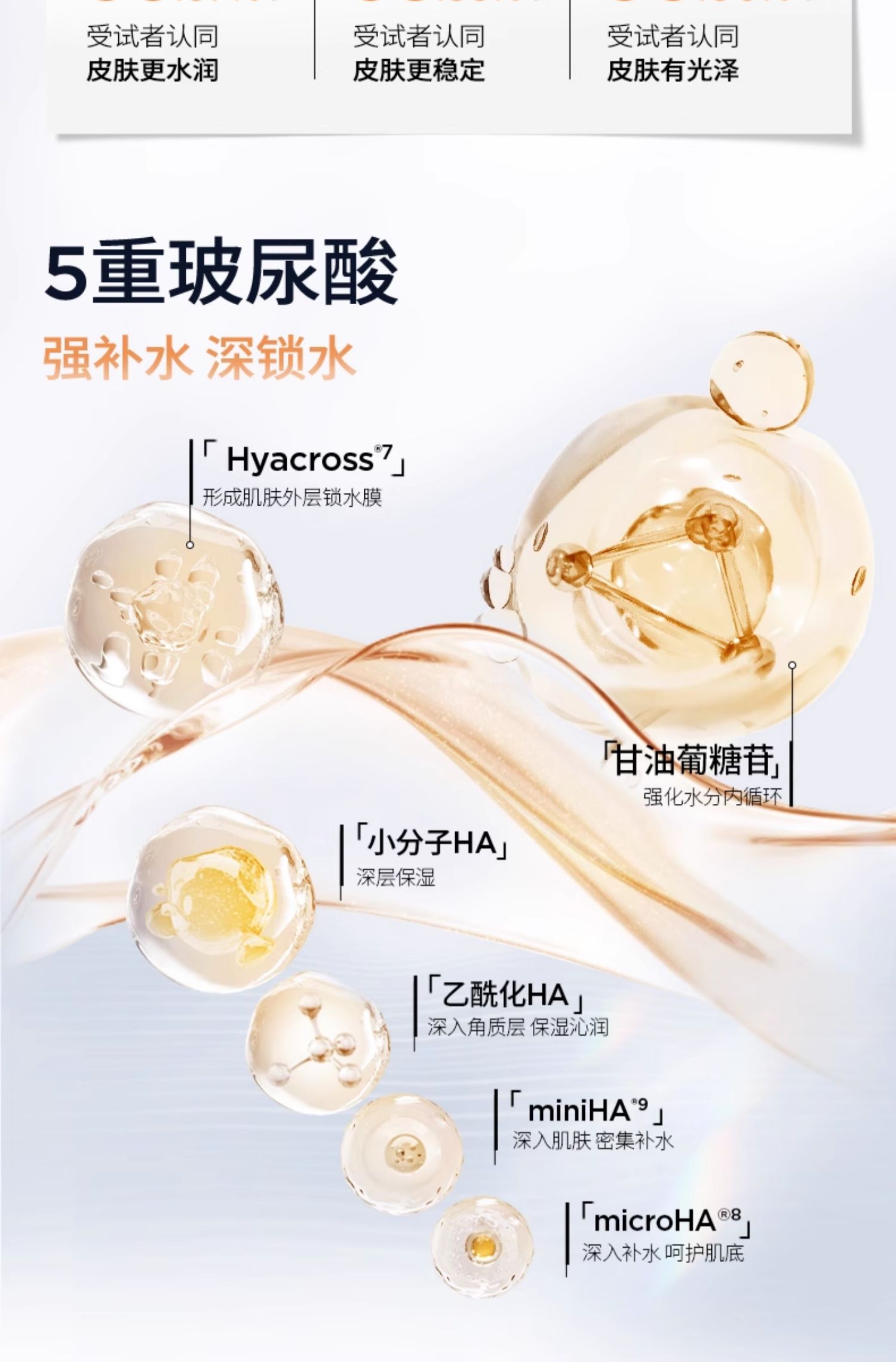 • 玻尿酸补水力:多重分子量透明质酸,快速渗透、层层保湿。