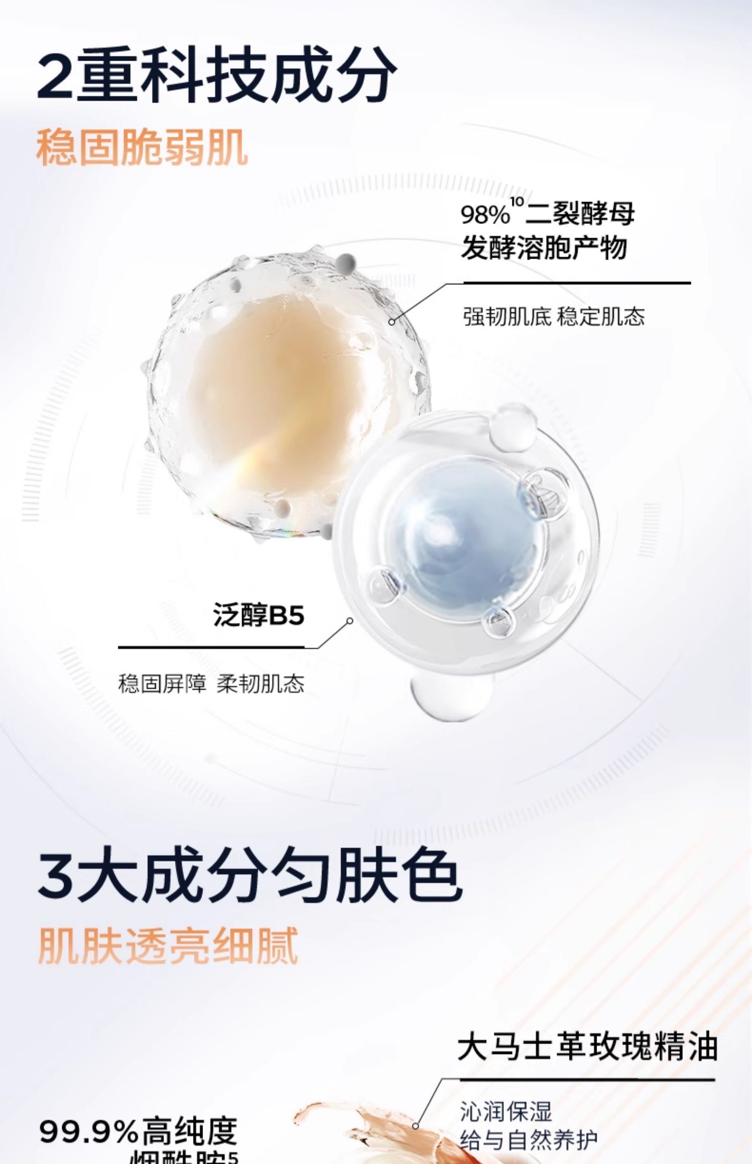 • 98% 二裂酵母发酵产物 + B5:温和舒缓,支持肌肤屏障健康,安抚干燥紧绷。