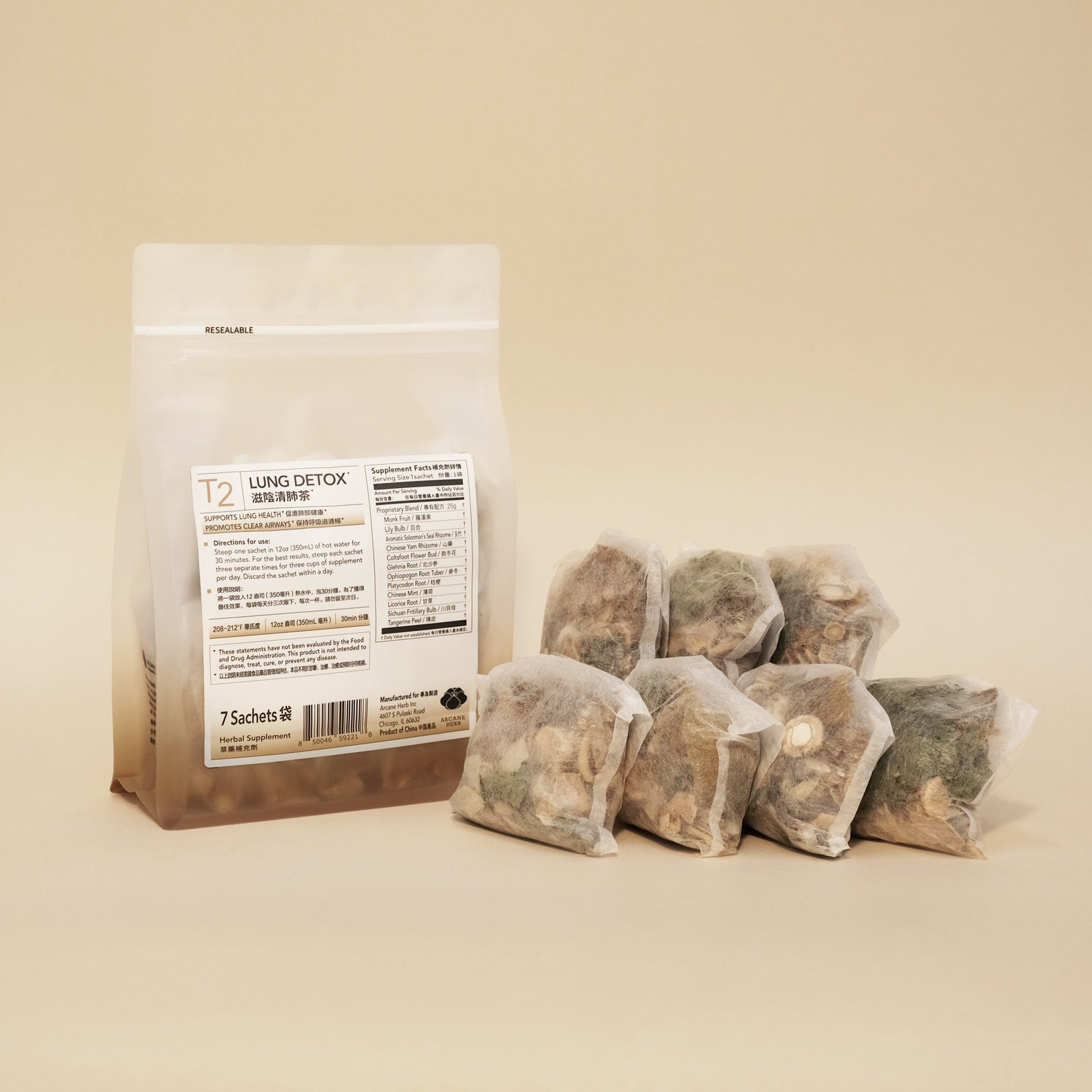 • 将 1 袋茶粉放入 350ml 沸水中浸泡 20–30 分钟,趁热饮用。