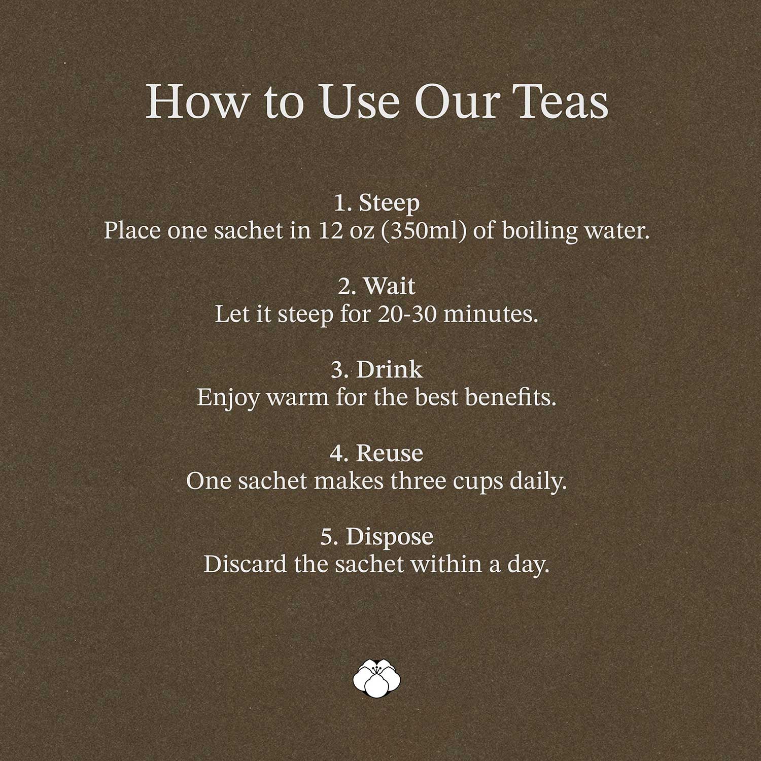 • 将一袋茶粉放入 350ml沸水中浸泡 20–30 分钟,然后趁热饮用。