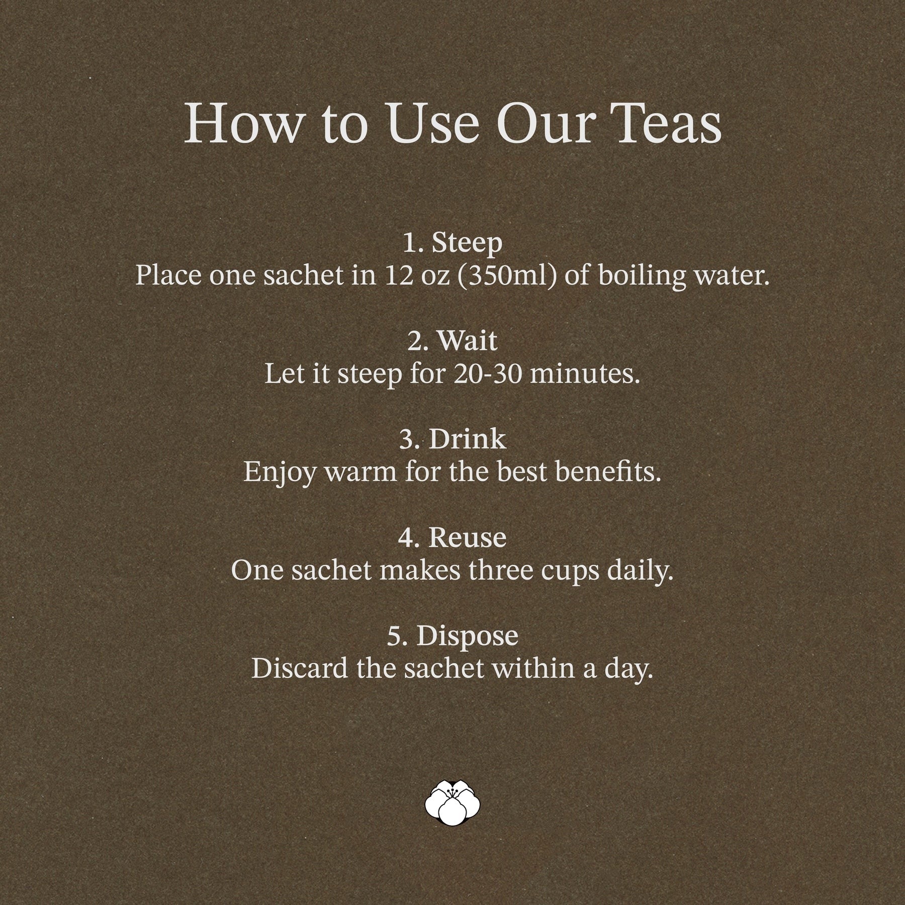 • 将 1 袋茶粉放入 350ml 沸水中浸泡 20–30 分钟,趁热饮用。